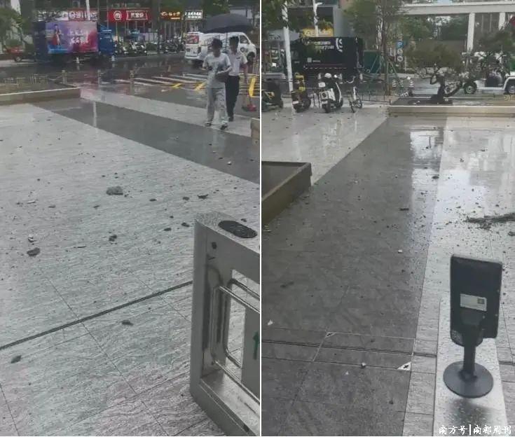 6月11日下午,深圳气象台发布的暴雨橙色预警信号正在生效,密集的雨幕中,宝安区沙井街道前海・华发新城华苑1区南门出入口突然砸下大片外墙材料,距离坠落点较近的小区业主被突如其来的动静惊得踉跄后退。